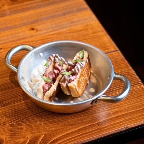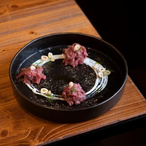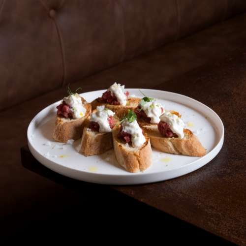 Toast Tiepido con Tartare di Fassona, Acciughe del Cantabrico Selezione Nardin e Mousse di Gorgonzola Dolce