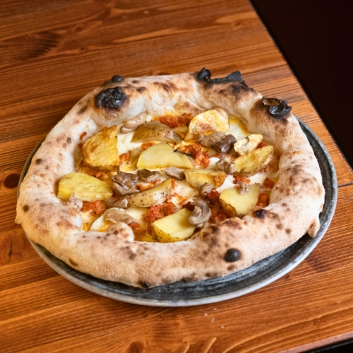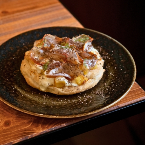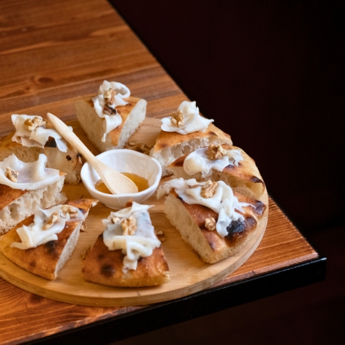 Pizza al padellino con Lardo di Suino Nero Az. Agr. Atena, Miele e Noci